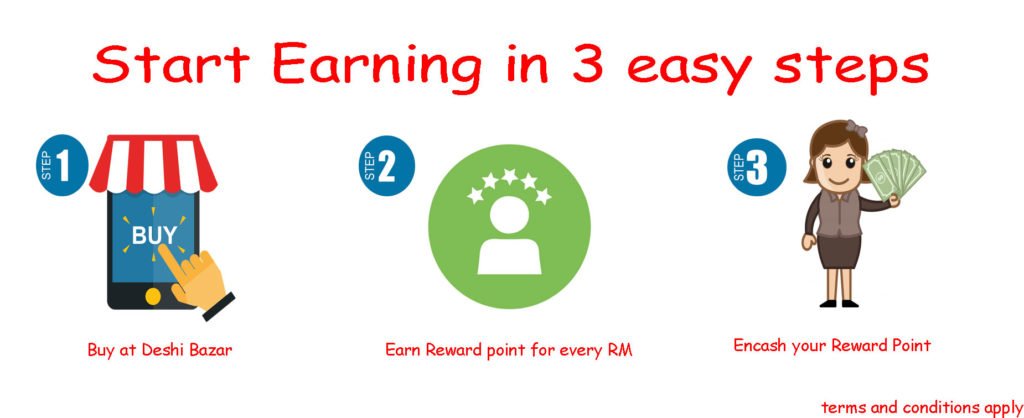 For every RM you are spending at www.deshibazar.com.my, you will earn one reward point. You can start avail discount from your reward points once you have minimum 500 reward points.